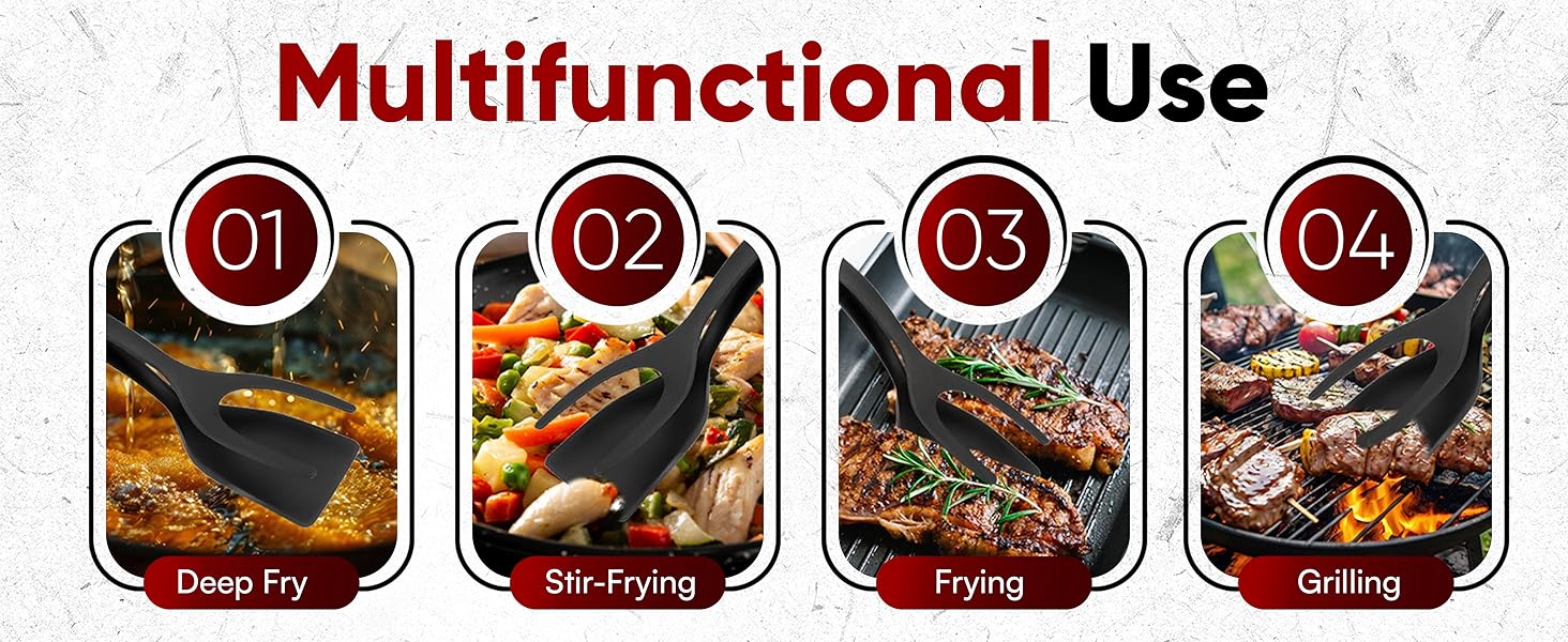 • 🍳Versatile 2-in-1 Design: Revolutionize your cooking experience with ease as you effortlessly egg flipper Spatula Tong and securely grip your foods. This innovative culinary tool is expertly designed to handle a variety of kitchen tasks with precision and versatility.